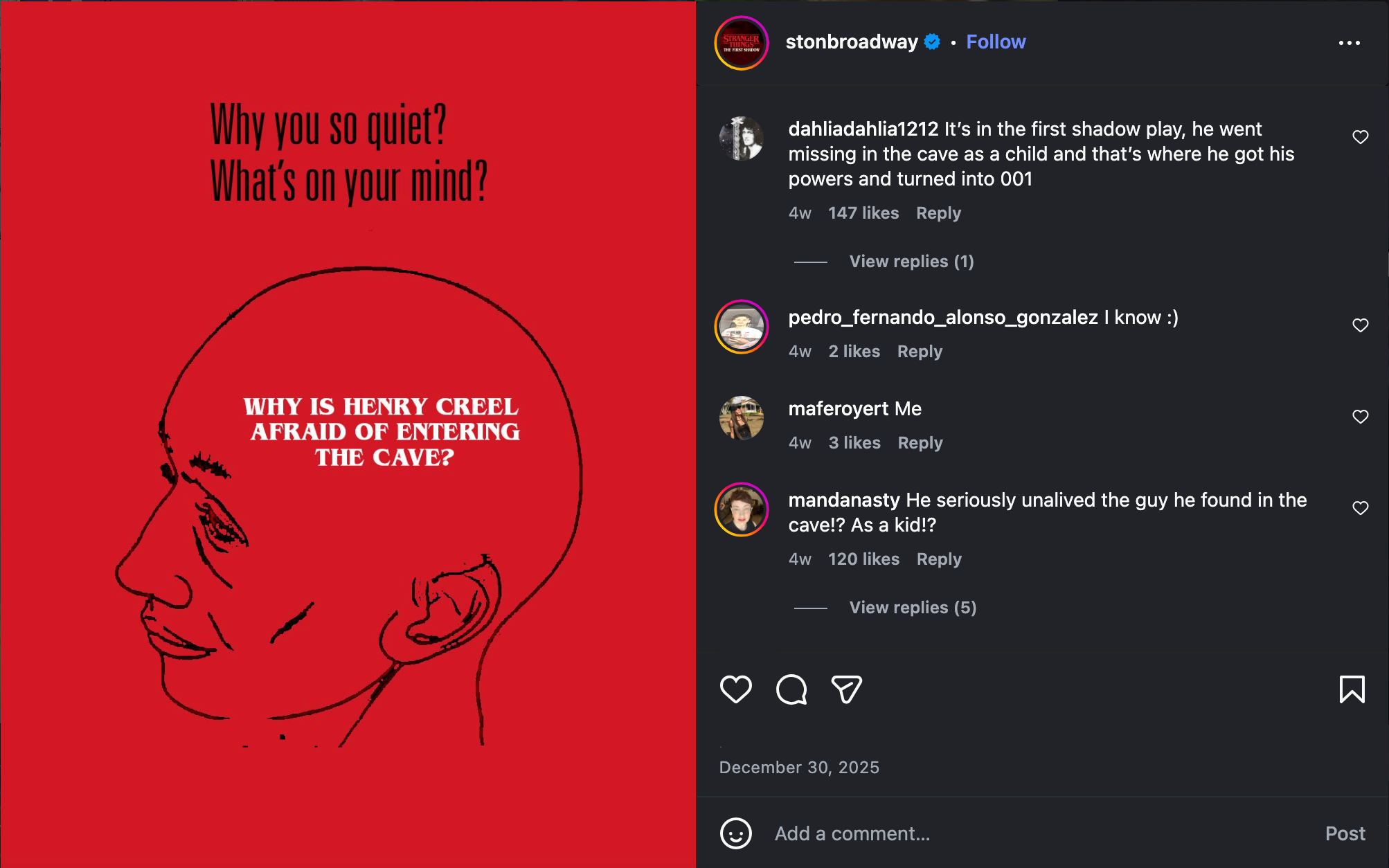 In this viral post, I wanted to convey that the Broadway play and the Neflix show are connected. This resonated with the fans online and got the fans watching Season 5 which was streaming at the time, excited to see what the Broadway show may hold.