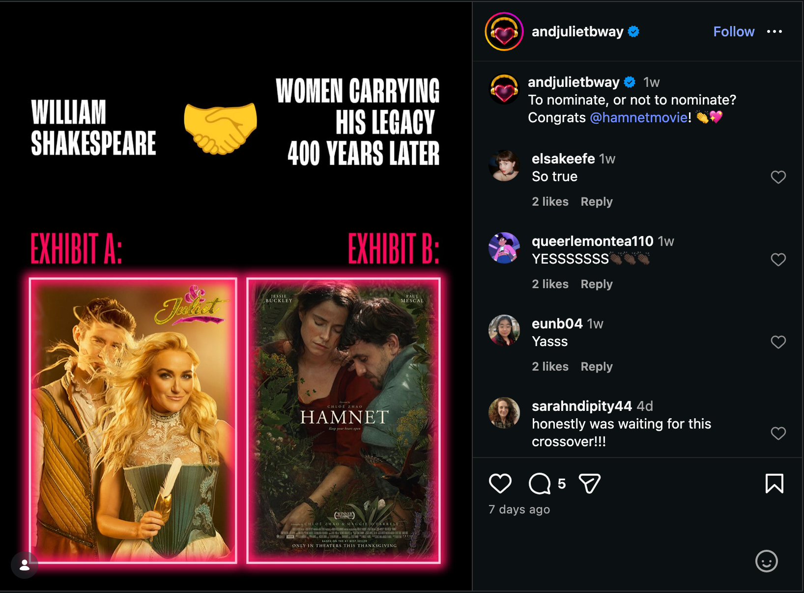 For shows like & Juliet, it was important to keep up with pop culture and tie it back to the brand. That is exactly what has been done to draw a parallel between Hamnet and & Juliet and the post was able to resonate with the followers in an authentic way.